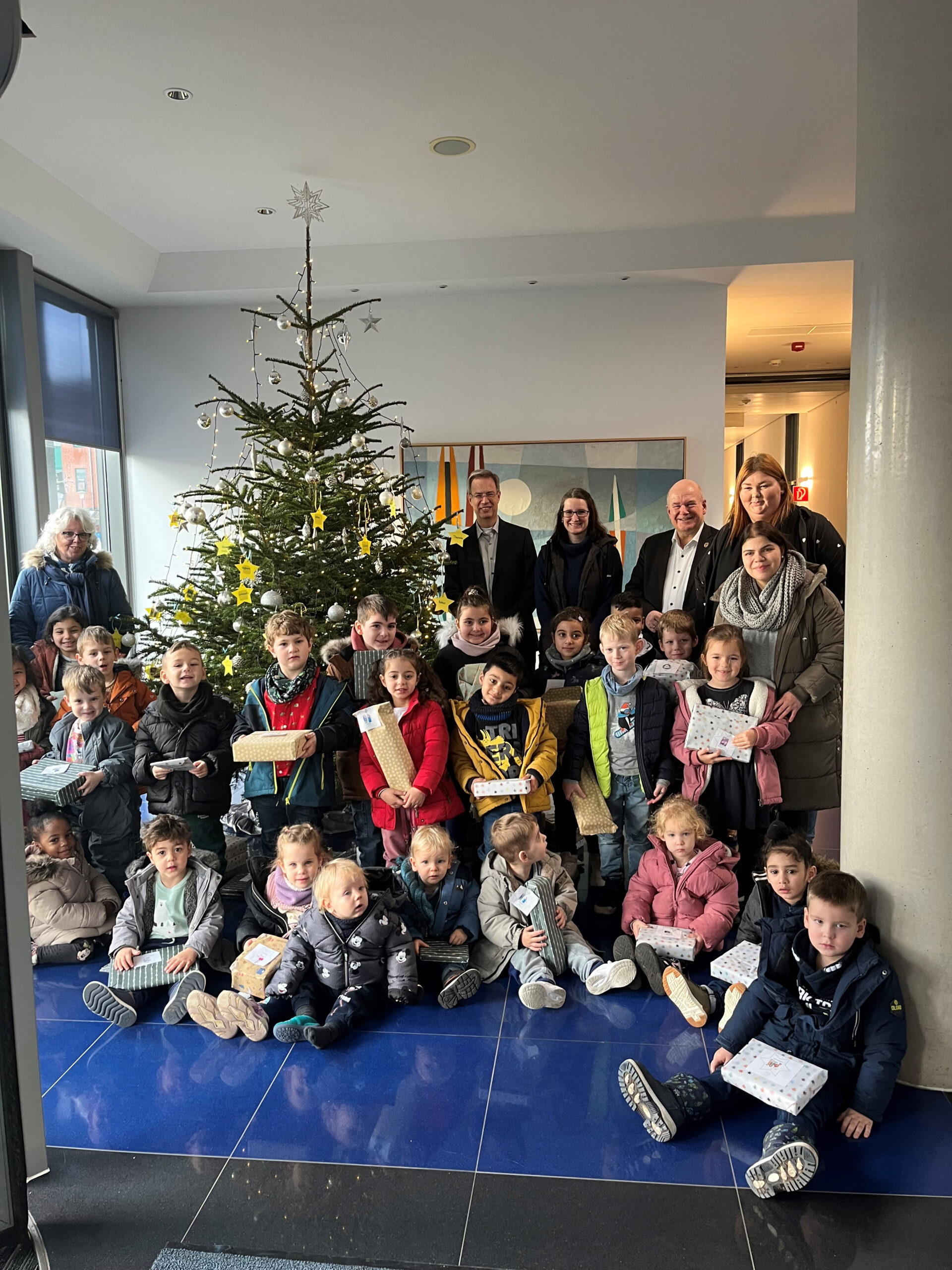 Im Verwaltungsgebäude des WVER wurde am 13.12.2023 unser Weihnachtsbaum im Foyer mit selbst gebastelten Wunschsternen von Kindern aus dem Kindergarten St. Joachim in der Meckerstraße 12 in Düren geschmückt.